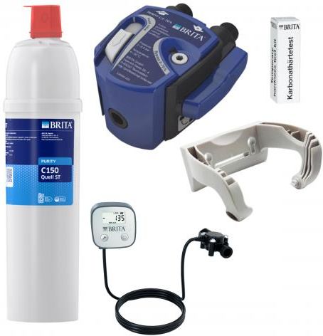 BRITA PURITY C 150 Quell ST - zestaw startowy Zestaw składa się z:    1)  Filtra wymiennego BRITA Purity C 150    2)  Głowicy z regulowanym obejściem 0-70%    3)  Uchwytu montażowego na ścianę    4)  Licznika przepływu wody BRITA FlowMeter    5) Testu kropelkowego do badania twardości węglanowej    Parametry filtra BRITA PURITY C 150 Quell ST Wydajność przy twardości węglanowej 10°dH/obejście 40%:  2408 l Maks. ciśnienie robocze:  8,6 bara Temperatura wody na wejściu: 4-30 °C Wymiary (sz/gł/wy) głowicy z filtrem:  117/104/419 mm Ciężar (suchy/mokry):  1,8/2,8 kg Położenie robocze: poziome i pionowe   Wkłady filtracyjne PURITY C Quell ST zaprojektowano specjalnie z myślą o zastosowaniu w lokalach gastronomicznych, firmach cateringowych i w urządzeniach vendingowych. Obniżają one twardość węglanową wody pitnej, znacząco zmniejszając ryzyko powstawania osadów wapiennych w podłączonym urządzeniu. Wiążą one również jony metali, takich jak ołów lub miedź. Filtr redukuje substancje zakłócające smak i aromat (na przykład pozostałości chloru) zarówno w filtrowanej wodzie, jak i w wodzie z obejścia. Do typowych obszarów zastosowań wkładów filtrujących PURITY C należą ekspresy do kawy, urządzenia vendingowe oraz piekarniki i piece konwekcyjno-parowe.   Korzyści – stała jakość wody do wielu zastosowań: Skuteczne zapobieganie odkładaniu się kamienia czyli zmniejszenie ilości usterek oraz kosztów napraw i serwisu. Usuwanie niepożądanych substancji smakowych i zapachowych z filtrowanej wody (także z wody z obejścia) w celu uzyskania doskonałej jakości produktu końcowego. Koncepcja jednej głowicy pasującej do wszystkich filtrów z rodziny PURITY C z możliwością dokonania ustawień na głowicy dopasowanych do indywidualnych potrzeb. Prosty system wymiany wkładu z innowacyjną dźwignią blokującą, która zapewnia odpowiednie bezpieczeństwo użytkowania. Zintegrowany zawór płukania oraz wejście i wyjście wody umiejscowione z jednej strony głowicy mają istotny wpływ na oszczędność miejsca i obsługę filtra
