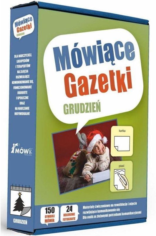 Mówiące gazetki. Grudzień - Mówik Materiały ćwiczeniowe na rewalidację i zajęcia rozwijające komunikowanie się dla osób ze złożonymi potrzebami komunikacyjnymi. Treści tematyczne miesiąca GRUDZIEŃ: Mikołaj Moja choinka Moje święta Bożego Narodzenia Teczka zawiera następujące elementy: 24 kolorowe tablice (fotografie i obrazy), 144 symbole MÓWik z wykorzystaniem kodu kolorów, 6 dodatkowych symboli (pytania lub powiedzenia), rzepy do podklejenia tablic i symboli. Tablice dydaktyczne W pomocy tej zostały wykorzystane tablice dydaktyczne oraz symbole MÓWik, zawierające różne części mowy: rzeczowniki, czasowniki, przymiotniki, co pozwala na tworzenie wypowiedzi jedno, dwu i trójelementowych. Zatem, wykorzystując Mówiące gazetki , nauczyciel, rodzic czy terapeuta mają możliwość modelowania prostych wypowiedzi podopiecznych z zakresu wielu różnych tematów. Z pomocy tej mogą korzystać nauczyciele, logopedzi i terapeuci na zajęciach rewalidacyjnych, a także edukacyjnych, takich jak zajęcia rozwijające komunikowanie się, funkcjonowanie osobiste i społeczne oraz na nauczaniu indywidualnym. Mówiące gazetki mogą stanowić również elementy dekoracyjne w klasie, gdzie uczniowie utrwalają podstawowe wiadomości z Podstawy programowej 2017 dla uczniów z niepełnosprawnością intelektualną w stopniu umiarkowanym i znacznym. MÓWik Słownictwo (symbole MÓWik) zaproponowane do danego tematu można wykorzystywać do wszystkich tablic w danej grupie tematycznej. Tytuły poszczególnych tablic podpowiadają tematy zajęć, na przykład związane z aktualną porą roku czy uroczystościami w domu i szkole. Użytkownik podczas pracy i ćwiczeń z pomocą dydaktyczną Mówiące gazetki rozszerza swoje słownictwo z zakresu dotyczącego najbliższego środowiska rodzinnego, społecznego i przyrodniczego. Pomoc Mówiące gazetki została podzielona na 10 teczek. Każda z nich przeznaczona jest do pracy w danym miesiącu roku szkolnego (od września do czerwca). Każda tablica (fotografia lub obraz) i symbol MÓWik wyposażony jest w rzep do przyklejenia (na odwrocie). Dzięki temu rozwiązaniu elementy mogą być wielokrotnie umieszczane na klasowej tablicy mobilnej (dwustronna, tekstylna, szara) lub na ławce ucznia. Nad każdym symbolem MÓWik umieszczony jest podpis. Takie rozwiązanie wspomaga umiejętność globalnego czytania (fotograficzne odczytywanie całych słów bez dzielenia ich na sylaby lub litery). Równoczesne zestawienie tablicy i symbolu z podpisem pomaga w rozwoju percepcji wzrokowej, ułatwia lepsze spostrzeganie i rozumienie otaczającego świata. Rozmiar tablic i symboli MÓWik pozwala na wykorzystanie ich również przez osoby z niepełnosprawnością ruchową, poruszających się na wózku inwalidzkim wyposażonym w stolik. W symbolach MÓWik użyty został kod kolorów. Znaczenie kolorów pomarańczowy – osoby i zwierzęta mające imię, np. zwierzęta domowe, żółty – przedmioty i zwierzęta, zielony – czynności, niebieski – przymiotniki, przysłówki, biały – określenia dotyczące czasu, różowy – zwroty konwersacyjne, wyrażenia ekspresyjne, złożone pytania. W trakcie budowania wypowiedzi zaleca się używania klucza Fitzgerald, czyli sposobu ustawiania symboli na tablicy w sposób, który odzwierciedla szyk wyrazów w prostym zdaniu pojedynczym (podmiot, orzeczenie, dopełnienie), tak, by ułatwić budowanie wypowiedzi.