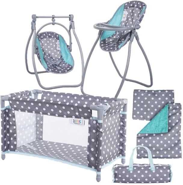 Doris Łóżeczko + Krzesełko Do Karmienia Zestaw Dla Lalek R Szaro-Zielony Kropki Żywiec