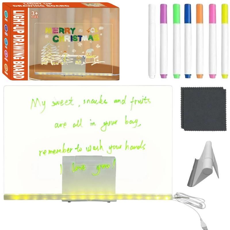 Szukasz nowoczesnego i funkcjonalnego dodatku do pokoju dziecka, biura, sypialni lub salonu? Kreatywna Tablica LED to wyjątkowe połączenie praktyczności, designu i zabawy. Dzięki podświetlanej powierzchni do pisania możesz tworzyć kolorowe notatki, rysunki i wiadomości, które świecą w ciemności, tworząc efekt 3D. Najważniejsze cechy: Duża powierzchnia do pisania: 20 x 30 cm Podświetlenie LED – idealne do wieczornej zabawy i użytkowania Zasilanie: USB – energooszczędna technologia - długość kabla 97 cm Wysokiej jakości materiał: akryl i tworzywo sztuczne Łatwa w czyszczeniu – wystarczy przetrzeć ściereczką - w zestawie 2 sztuki Uniwersalna podstawka – regulowana, do ustawienia na biurku, półce lub stoliku nocnym W zestawie aż 7 kolorowych pisaków i 2 ściereczki do czyszczenia Dlaczego warto? Wielofunkcyjność: sprawdzi się jako tablica edukacyjna, dekoracja LED, praktyczny notatnik lub miejsce do kreatywnego rysowania Efekty 3D i iluzja przestrzeni: specjalna płyta z wysoką przepuszczalnością światła w połączeniu z LED-ami tworzy wyjątkowy efekt wizualny Bezpieczeństwo użytkowania: nie nagrzewa się, bezpieczna dla dzieci Świetny pomysł na prezent: dla dziecka, nastolatka, rodzica, a także jako oryginalny gadżet do biura lub domu Prosta obsługa: tablica działa po podłączeniu do źródła zasilania USB, bez konieczności instalowania dodatkowego oprogramowania Zastosowanie: Zostawianie notatek i wiadomości domownikom Tworzenie planu dnia, list zakupów, przypomnień Rysowanie i nauka pisania dla dzieci Dekoracja do pokoju z efektem świetlnym Oryginalny gadżet do pracy, biura lub jako lampka nocn Zestaw zawiera: Tablicę LED z płytką akrylową (20 cm x 30 cm) Regulowaną podstawkę 7 kolorowych pisaków 2 ściereczki do czyszczenia Zasilanie przez kabel USB (kabel w zestawie)