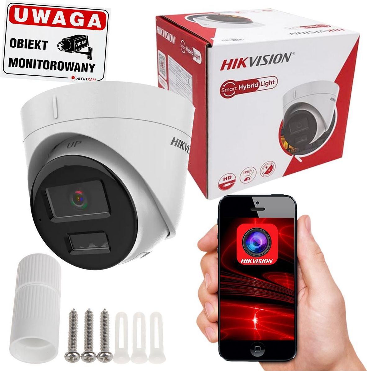 ZAWARTOŚĆ PUDEŁKA :✅ Kamera kopułowa HIKVISION DS-2CD1343G2-LIU✅ Instrukcja obsługi✅ Komplet elementów podłączeniowych i montażowychDODATKOWO W ZESTAWIE:✅ Tablica informacyjna " UWAGA ! Obiekt monitorowany " ⭐ KAMERA KOPUŁOWA 4MP HIKVISION DS-2CD1343G2-LIU⭐DO ZASTOSOWAŃ WEWNĄTRZ I NA ZEWNĄTRZ OBIEKTÓWWysoka rozdzielczość 4 Mpx w połączeniu z dobrej jakości przetwornikiem obrazu 1/3" Progressive Scan CMOS zastosowanym w kamerze pozwala na dostrzeżenie nawet najdrobniejszych szczegółów i zdarzeń w sposób transparentny i komfortowy dla użytkownika.Kamera wyposażona jest w szereg zaawansowanych technologicznie funkcji takich jak: Technologia Smart Hybrid Light - w trybie nocnym działa oświetlacz IR lub LED. Białe światło włączy się automatycznie dopiero w momencie wykrycia obiektu w monitorowanym obszarze, co skutecznie poprawia jakość obrazu Możliwość wyłączenia oświetlacza LED WDR - 120 dB - Szeroki zakres dynamiki oświetlenia 3D-DNR - Cyfrowa redukcja szumu w obrazie ROI - poprawianie jakości wybranych fragmentów obrazu BLC - kompensacja światła wstecznego (tła) HLC - Kompensacja silnego światła (punktowego) Możliwość zmiany rozdzielczości, jakości i przepustowości Obrót obrazu i odbicie lustrzane Sharpness - Wyostrzanie konturów obrazu sabotaż wideo Konfigurowalne strefy prywatności Inteligentna detekcja ruchu (z rozróżnieniem ludzi oraz pojazdów) Szeroki kąt widzenia kamery wynoszący aż 98 stopni umożliwia precyzyjne uchwycenie kadru oraz obserwacje dużego pola będącego w jej zasięgu.Oświetlacz światła białego LED oraz Promiennik podczerwieni IR do 30 metrów pozwala na obserwację niedoświetlonych trudno dostępnych zakamarków o każdej porze dnia oraz czytelny obraz w nocy nawet w całkowitej ciemności.Kamera ma wodoodporną obudowę o klasie szczelności IP67 dzięki której jest odporna na wszystkie warunki pogodowe i uszkodzenia mechaniczne i może być stosowana zarówno wewnątrz jak i na zewnątrz obiektów. ⭐KORZYŚCI WYNIKAJĄCE Z ZAKUPU KAMERY :⭐✔️ Wysoka rozdzielczość kamery 4 Mpx pozwalająca dostrzec nawet najdrobniejsze szczegóły✔️ Szereg inteligentnych funkcji zastosowanych w kamerze optymalizujących i poprawiających jakość obrazu✔️ Technologia Smart Hybrid Light pozwala na włączenie oświetlacza LED w momencie wykrycia obiektu w strefie monitorowania✔️ Szeroki kąt widzenia zastosowany w kamerze ułatwia uchwycenie odpowiedniego kadru✔️ Wbudowany mikrofon pozwalający na rejestrację dźwięku z otoczenia✔️ Oświetlacz światła białego LED oraz Promiennik podczerwieni IR do 30m zastosowany w kamerze umożliwiający widoczność w całkowitej ciemności✔️ Kamera odporna na każde warunki atmosferyczne do zastosowań wewnątrz i na zewnątrz budynku✔️ Aplikacja na telefon pozwalająca na podgląd i odtwarzanie obrazu z kamer ⭐SPECYFIKACJA:⭐ ⭐WYBRANE FUNKCJE KAMERY:⭐