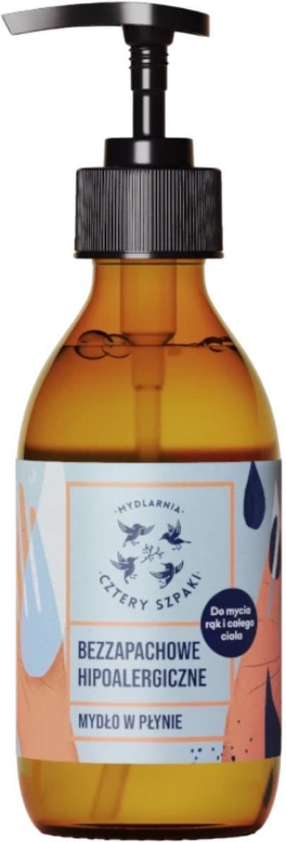 Mydlarnia Cztery Szpaki Mydło w Płynie Bezzapachowe Hipoalergiczne 300ml Mydło w płynie Bezzapachowe Hipoalergiczne od Mydlarni Cztery Szpaki to delikatna propozycja stworzona z myślą o osobach o skórze bardzo wrażliwej, skłonnej do alergii i atopii. Zawiera wyłącznie niezbędne składniki bazowe, dzięki czemu minimalizuje ryzyko podrażnień. Formuła mydła oparta na łagodnych składnikach pochodzenia roślinnego skutecznie oczyszcza skórę, nie naruszając jej naturalnej bariery ochronnej. Nie zawiera substancji zapachowych ani barwników, dlatego idealnie sprawdzi się również w pielęgnacji dzieci i osób z nadwrażliwą skórą. Mydło w płynie Bezzapachowe Hipoalergiczne może być stosowane zarówno do mycia rąk, jak i całego ciała. To doskonały wybór dla tych, którzy cenią prostotę, bezpieczeństwo i skuteczność w codziennej pielęgnacji. Korzyści ze stosowania - Odpowiednie dla skóry wrażliwej, alergicznej i atopowej - Bez zapachu, barwników i drażniących detergentów - Łagodna, naturalna formuła oparta na składnikach roślinnych - Do mycia rąk i całego ciała, również dla dzieci Sposób użycia Nanieś niewielką ilość mydła na wilgotną skórę dłoni lub ciała, delikatnie spień i spłucz wodą. Stosuj codziennie, także w pielęgnacji wrażliwej skóry. Pojemność: 300ml