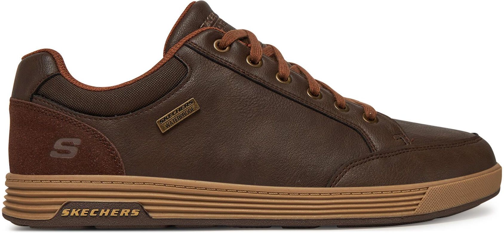 Stylowe i funkcjonalne – brązowe sneakersy męskie Skechers to niezastąpiony wybór dla tych, którzy cenią wygodę na najwyższym poziomie. Wyposażone w technologię Air-Cooled, zapewniają doskonałą wentylację i uczucie świeżości przez cały dzień. Dodatkowo, wkładka Memory Foam perfekcyjnie dopasowuje się do kształtu stopy, oferując wyjątkową amortyzację i redukcję zmęczenia. Dzięki właściwościom Waterproof, buty skutecznie chronią przed wilgocią, zapewniając suchy komfort w każdych warunkach. To sneakersy, które łączą nowoczesne rozwiązania z uniwersalnym designem!