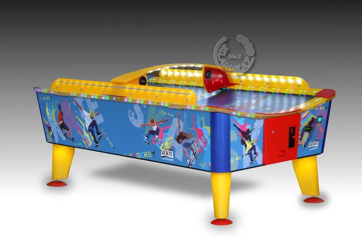 Skate to produkt w 100% wodoodporny. Dzięki innowacyjnym technologiom zastosowanym przy jego produkcji, urządzenie może być użytkowane na zewnątrz praktycznie przez cały rok. Nawet, jeżeli użytkowanie automatu na zewnątrz nie jest planowane, jego wodoodporność może przydać się również pod zadaszeniem, ponieważ chroni urządzenie przed awarią spowodowaną zalaniem napojem. Unikalny kształt blatu wpływa na szybkość gry i gwarantuje świetną zabawę. Niecodzienny wygląd i zaawansowane technologie sprawiają, że Skate zarabia dla swoich właścicieli nawet do 40% więcej, niż tradycyjny cymbergaj, a co za tym idzie, szybciej zwracają się zainwestowane w niego pieniądze. Rozbudowany software pozwala na wgrywanie własnych melodii, zapowiedzi i sygnałów, a zintegrowany system suszenia w łatwy i szybki sposób umożliwia odprowadzenie wilgoci z urządzenia. Dodatkowym atutem jest szybki montaż i demontaż stołu. Charakterystyka: perforowane pole gry wykonane z poliwęglanu podświetlenie LED korony stołu osłony boczne i środkowa zapobiegające wypadaniu krążka z pola gry efektowne podświetlenie LED pola gry i nóg wrzutnik elektroniczny RM5 lub NRI elektroniczny wyświetlacz wyników dla obu graczy nadmuch powietrza za pomocą wentylatora o mocy 260 W umieszczonego wewnątrz stołu zasilanie 230V/50Hz; pobór mocy 60 W w trybie demo i 390 W w trybie gry akcesoria: 4 odbijaki, 6 krążków