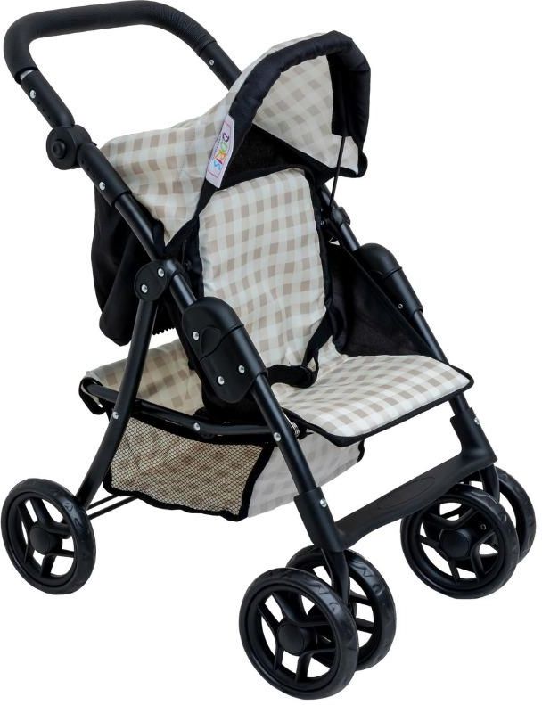 Wózek lalkowy spacerowy. Wykonany z rurek aluminiowych, materiał wierzchni – bawełna. Wózek posiada lekką, ale stabilną konstrukcję, piankową regulowaną na wysokość rączkę, gumowe, skrętne i podwójne przednie kółeczka. Wózek ma regulowane oparcie (można lalkę posadzić, jak również położyć), pod wózkiem umieszczono koszyczek na różne akcesoria. Dodatkowo zamocowano taśmę do przypięcia lalki. Wymiary wózeczka: - wys. do budki 63cm, - regulacja wysokości rączki 36 – 67 cm, - wys. siedziska od ziemi 26 cm, - średnica kółek ok. 14 cm, - szerokość wózka 37 cm, - szerokość siedziska 24 cm, - rozstaw osi 41 cm. Zestaw nie zawiera lalki widocznej na zdjęciu. Dodatki do wózka dostępne w innych ofertach na stronie. Wzór L, R, N1 są zastrzeżone w EUIPO. Stanowi to gwarancję oryginalności oraz autentyczności produktu. Wszelkie prawa zastrzeżone.